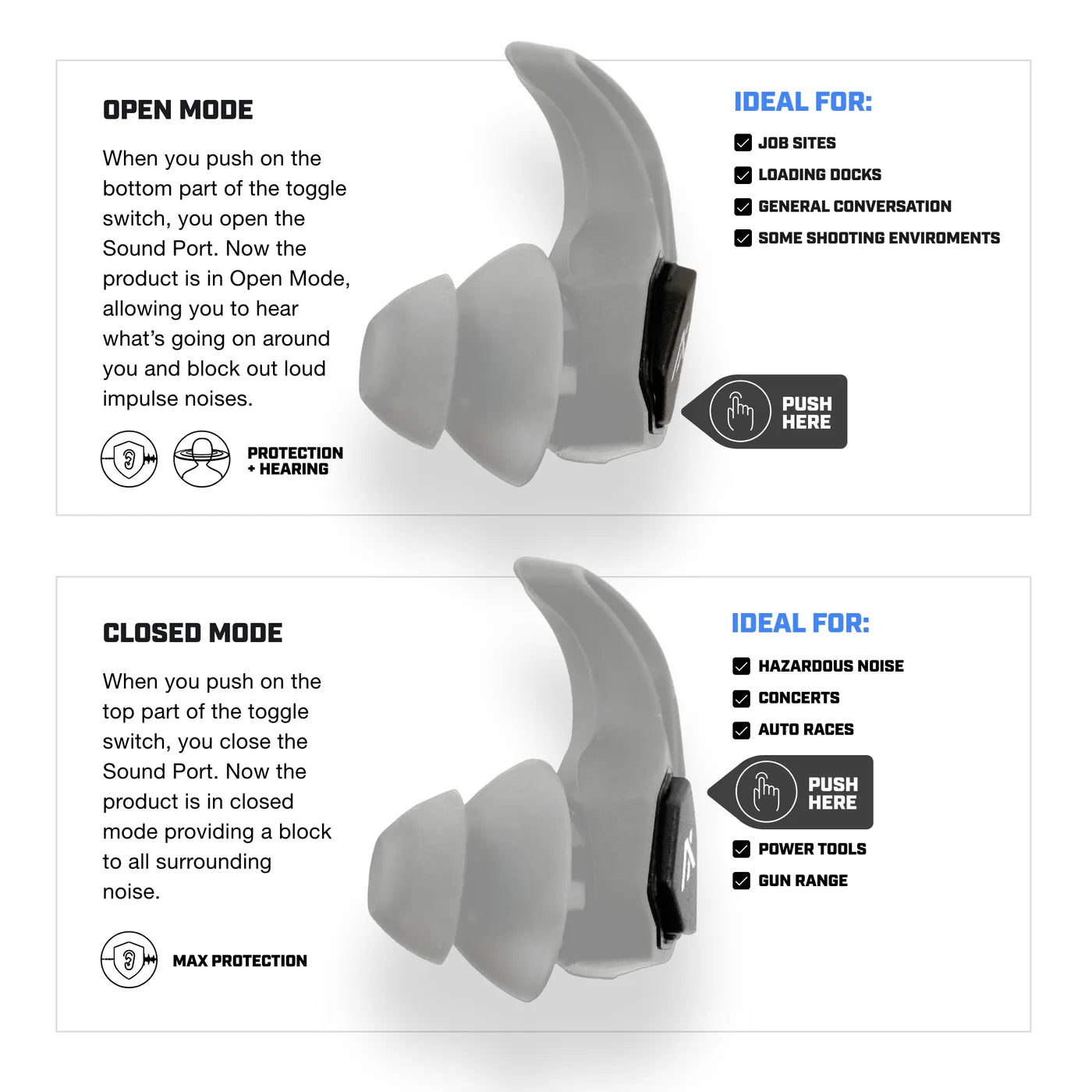 The X30i Earplug features a valve that opens and closes with a simple toggle switch. This lets you instantly transition between hearing and protecting at the same time or hearing protection only.