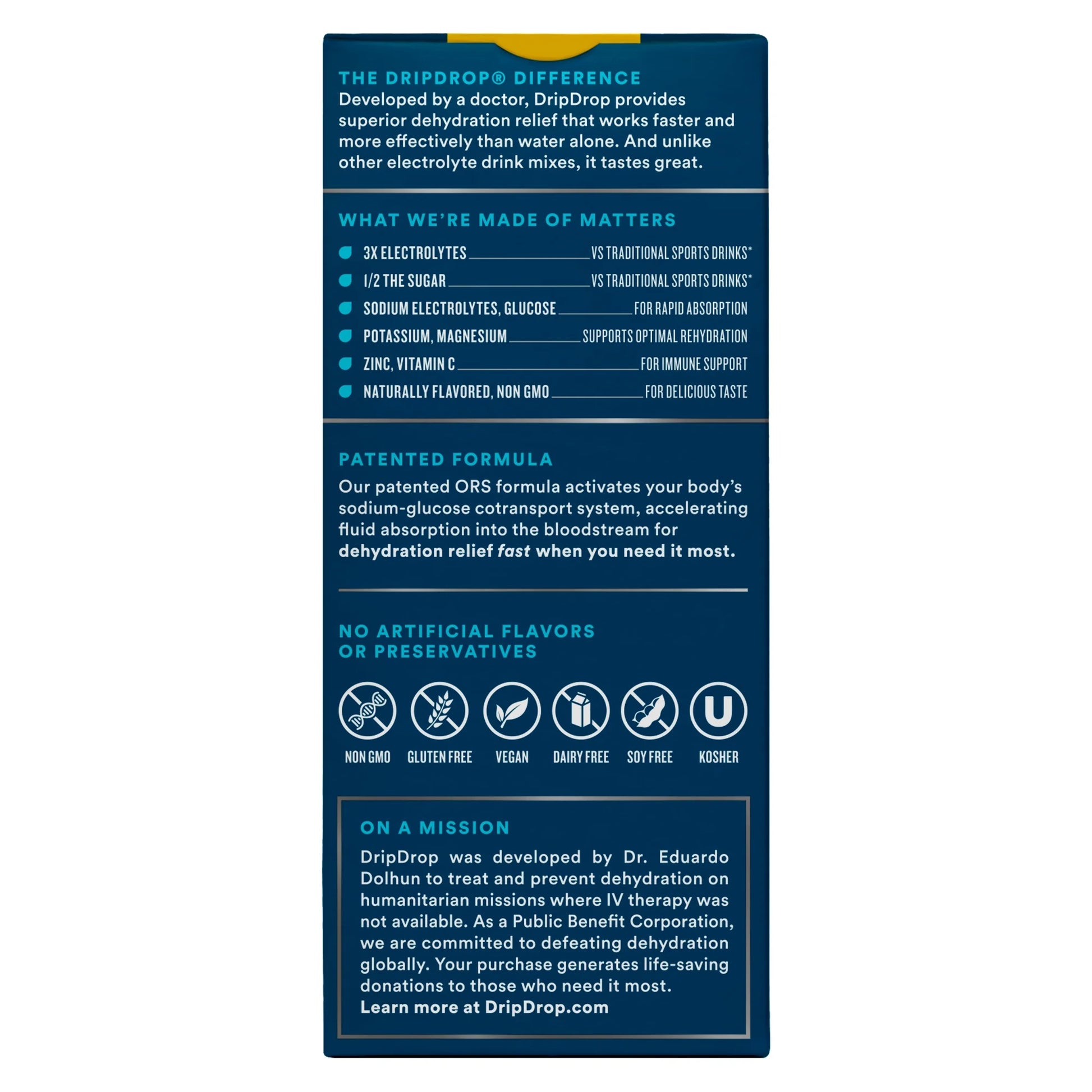 DripDrop is a great-tasting electrolyte powder that delivers superior dehydration relief faster and more effectively than water alone. DripDrop has 3x the electrolytes and half the sugar of typical sports drinks. Our patented doctor-developed formula contains electrolytes, glucose, potassium, and magnesium for rehydration.