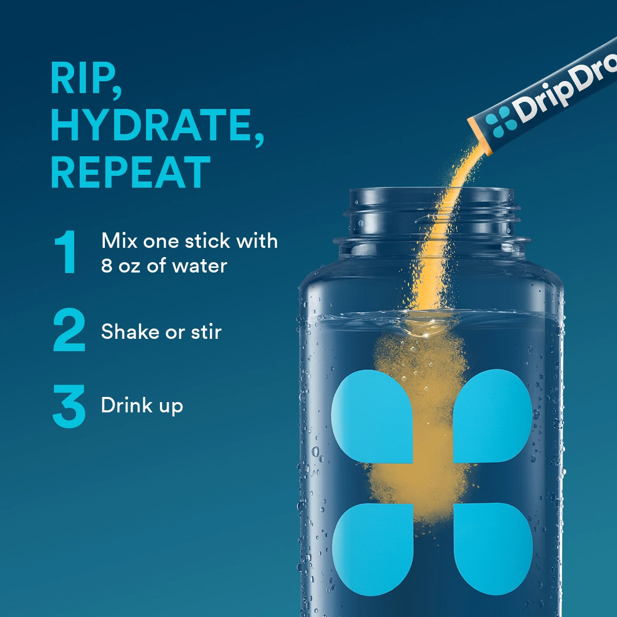 DripDrop is a great-tasting electrolyte powder that delivers superior dehydration relief faster and more effectively than water alone. DripDrop has 3x the electrolytes and half the sugar of typical sports drinks. Our patented doctor-developed formula contains electrolytes, glucose, potassium, and magnesium for rehydration.