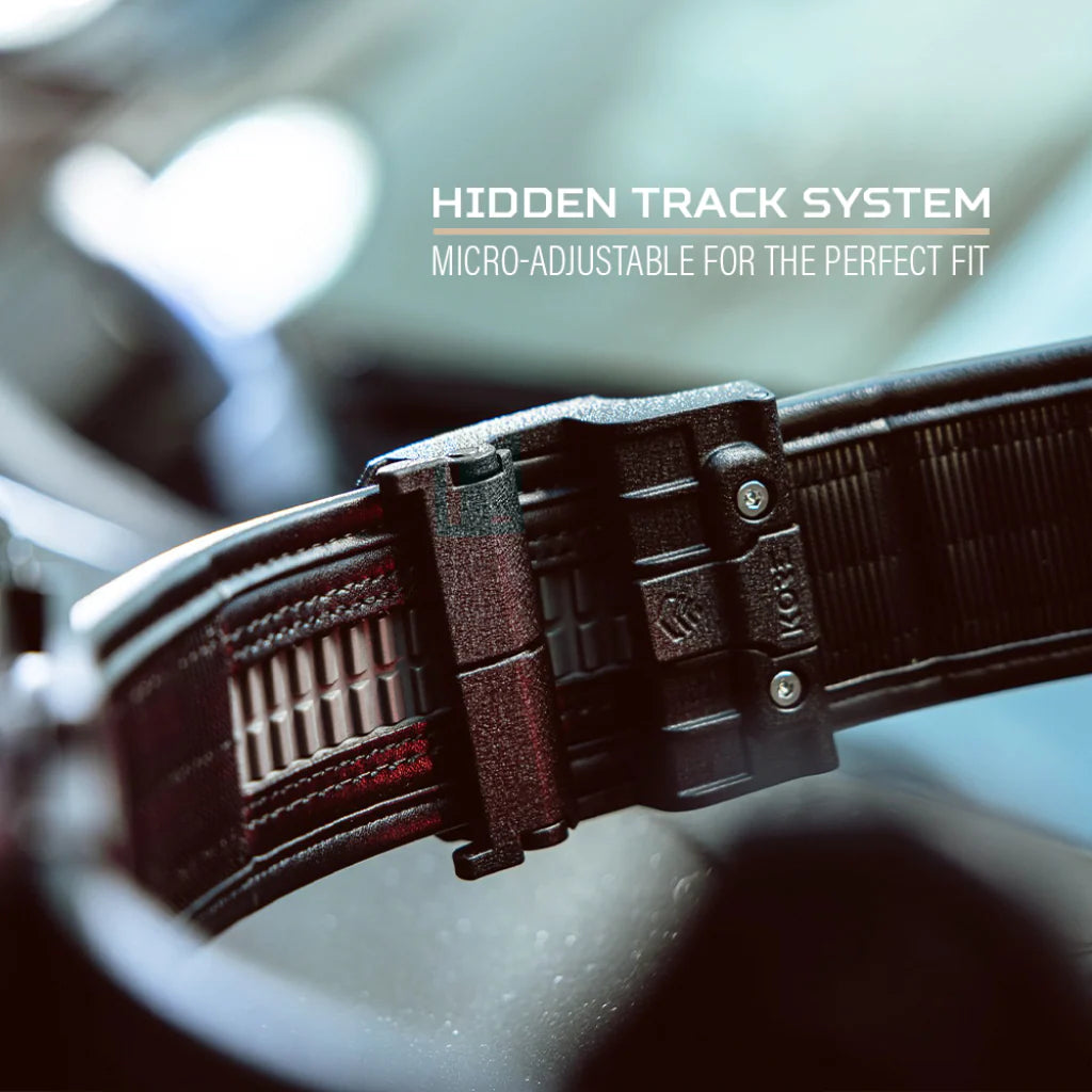 Total Adjustability. Kore 2" patrol belts use a patented, innovative track system that's sewn into the back of the belt. This hidden track lets you instantly tighten or loosen your belt in small 1/4" increments, without ever having to undo the belt or buckle. The result is a perfect fit all day - every day.